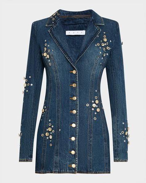 Area Crystal Button Studded Denim Mini Blazer Dress, Dark Blue Wash, Women's, 6, Cocktail & Party Wedding Guest Dresses Tuxedo & Blazer Dresses