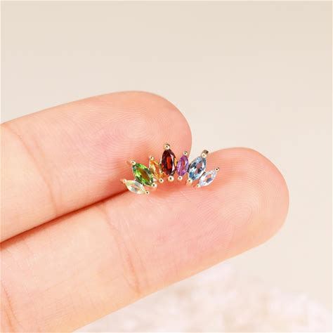 14K Solid Gold Multi-Colour Gemstone Cartilage Earring, Fan Shaped Threadless Push Pin Helix Stud, Natural Stone Rainbow Flat Back Piercing