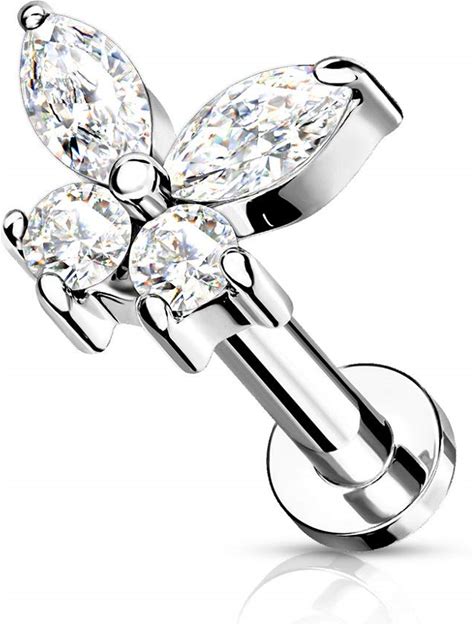 Pierced Owl 16G Stainless Steel Internally Threaded CZ Crystal Butterfly Top Flat Back Lip Cartilage Tragus Stud