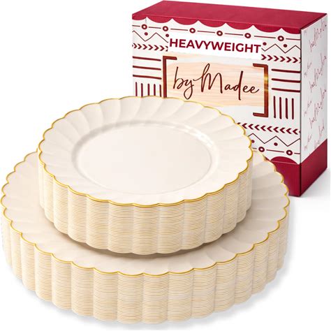 By Madee HEAVYWEIGHT 60 Pc Ivory And Gold Scalloped Plastic Party Plates- 30 Dinner & 30 Dessert Disposable Plates - Elegant & Fancy For Wedding,